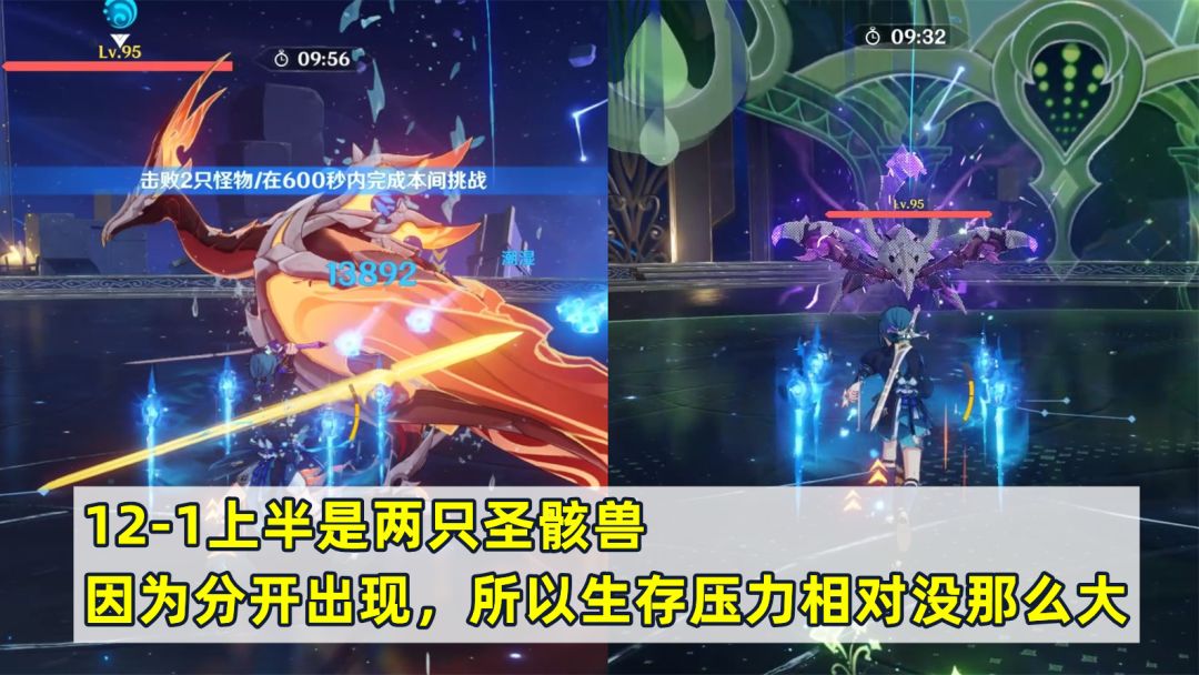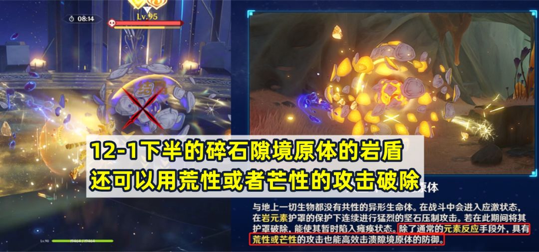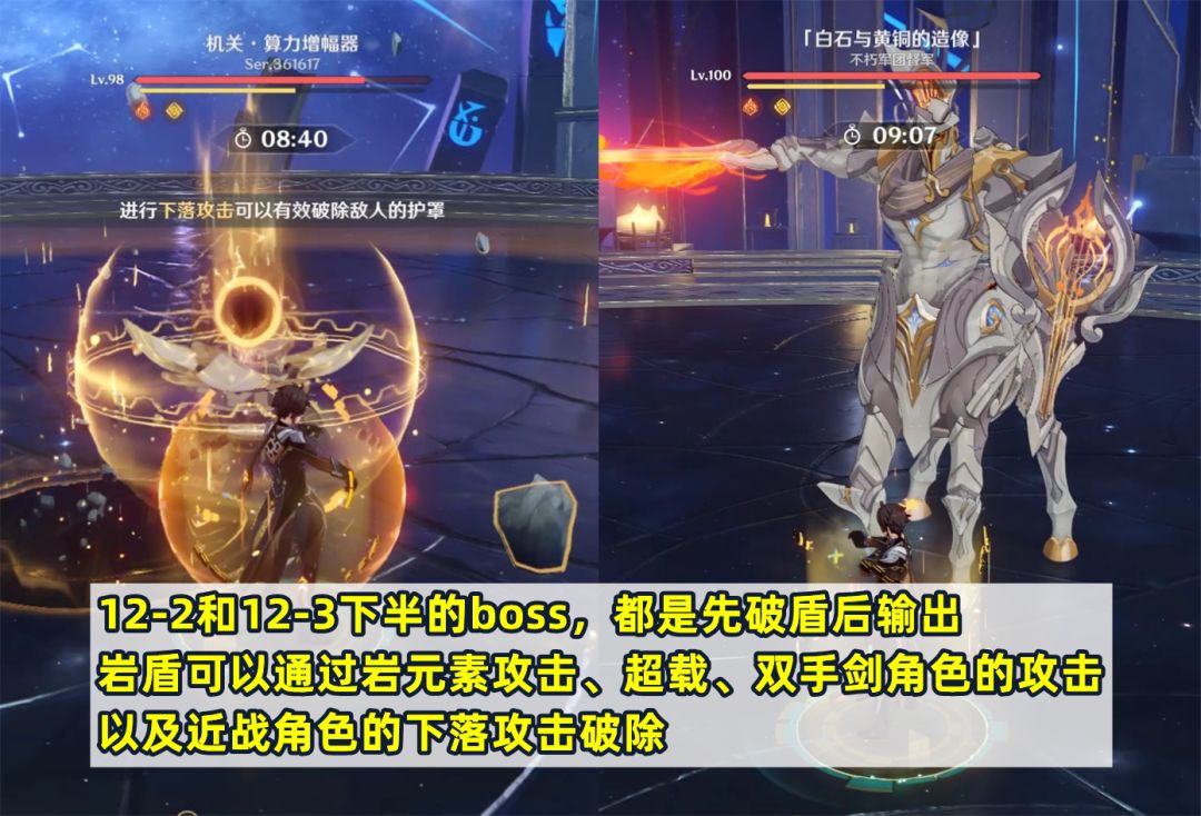 第二间下半和第三间下半的配置以及攻略思路比较相近,就放在一起讲了。都是需要破岩盾后再输出,且血量较高的单体boss,岩盾可以通过岩元素攻击、超载、双手剑角色的攻击以及近战角色的下落攻击破除。12层下半相对要更难,推荐上半尽快解决,尽量多留点时间给下半。