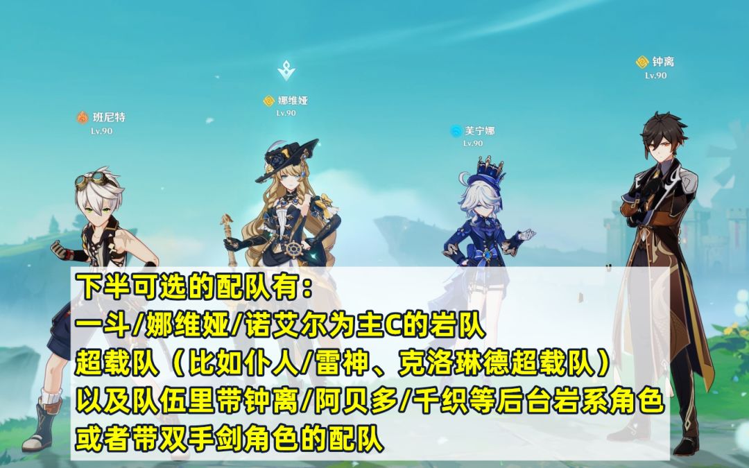 12层上半配队相对自由,除了第一间的圣骸兽可能对火C和雷C稍有限制外,只要是练度合格的队伍,都可以考虑走上半。下半可以选择一斗/娜维娅/诺艾尔为主C的岩队、超载队、以及队伍里带钟离/阿贝多/千织等后台岩系角色,或者带双手剑角色的配队等等。