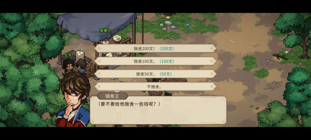 茶摊给乞丐两百块,这是刚刚在十字坡索要的赎金。然后给落魄江湖人送礼学机关术,还有体力顺便切磋一下。