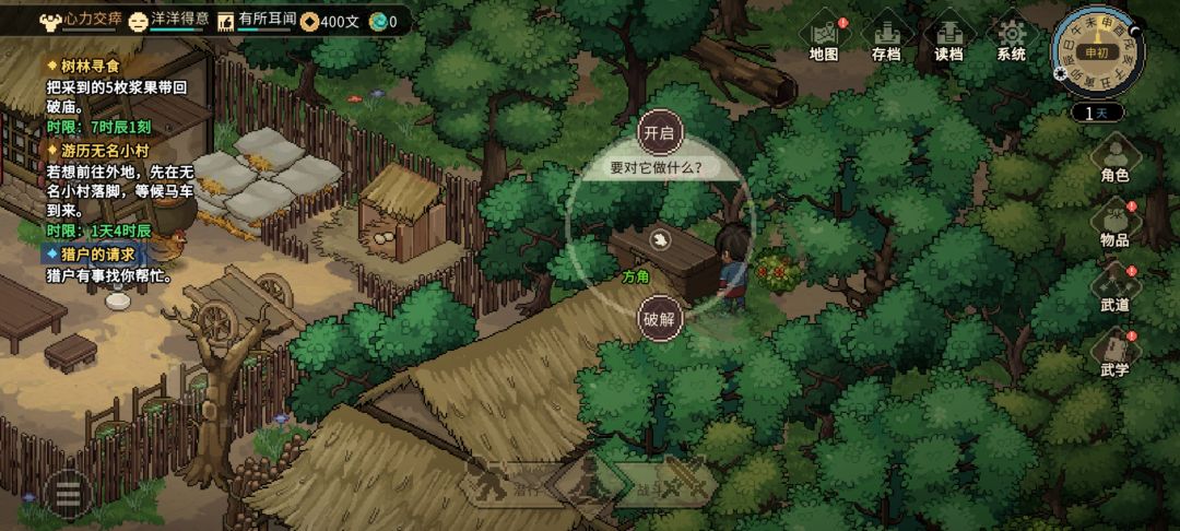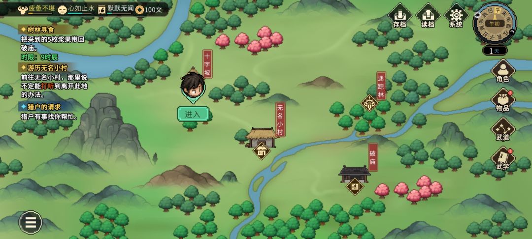 进村了,拜师!这一趟主要拿农田里的铲子和柴堆后面的藏宝图。