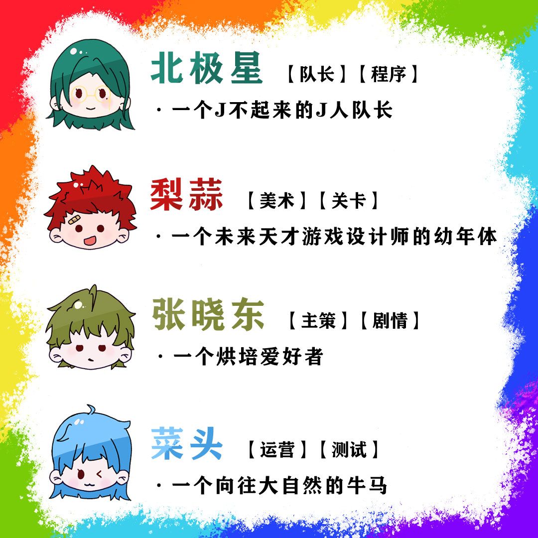 我们是一个由4人组成的工作室,大家都是现实里的好朋友。怀着对游戏的热爱,我们终于来参赛了!那么,正式介绍一下我们: