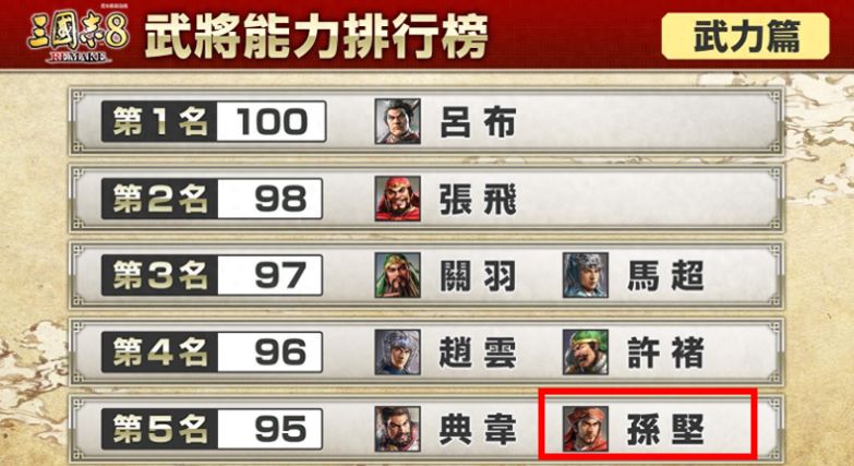 从吕布到典韦,大家都老老实实守着自己本来的咖位,新晋的黑马相信很多人都想不到,竟然是江东之虎孙坚。按照原版三国志11游戏的设定,孙坚无论是武力值还是自带战法,都只能勉强入围准一流,儿子孙策都比他高2点。三国志8的重制版是真的太看得起孙坚了,直接给提拔到了与恶来平起平坐的位置,孙策见了,估计得气到吐血。