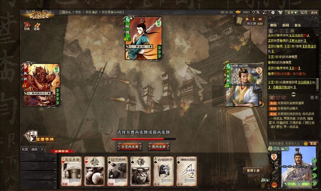 (4)如果为了弃光手牌,就先摸牌,然后当前阶段结束弃牌,先弃掉非杀及非伤害锦囊牌,直到最后。下图,为了配合鲁肃,弃掉了七张手牌。