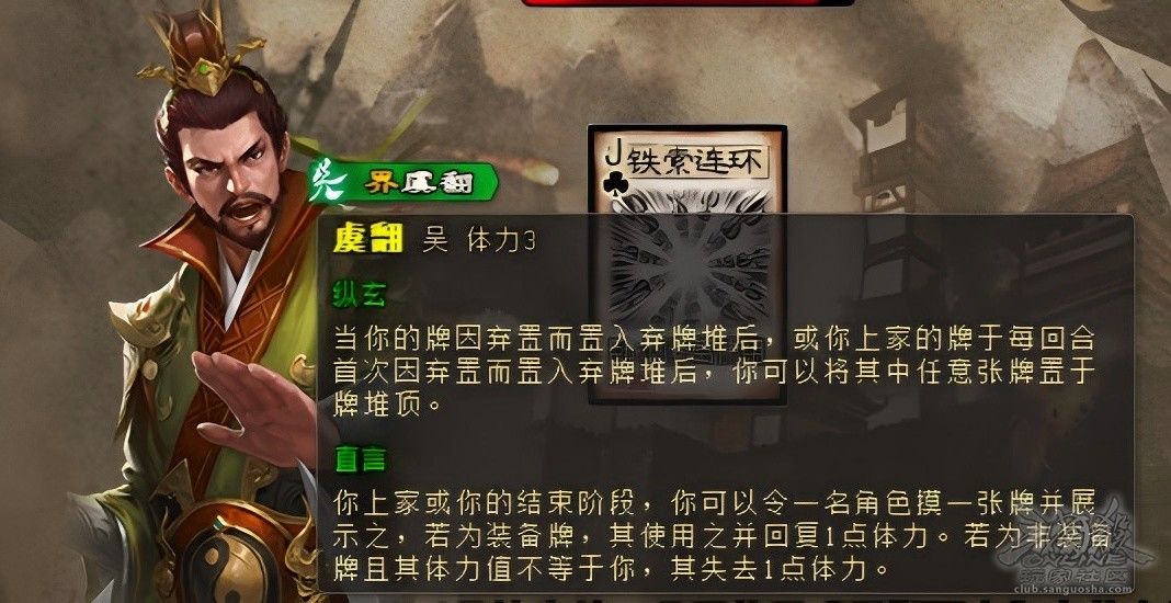 界虞翻除了最肉眼可见的“遇事不决多摸两张”的收益以外,简单来说可以分为三类: ◆第1类回复体力与流失体力,【直言】搭配【纵玄】精准定位【直言】给出手牌的类型,缺装备是原先玩标虞翻存在的一个问题,界虞翻【纵玄】能够捡上家弃置的装备为自己所用,且两发【直言】也增大了自身过到装备牌的概率,是在没有装备还可以选择流失敌人体力,因此这组收益是实实在在的收益,而不会像某些武将花里胡哨一顿操作,结果一看敌人一血未掉。 ◆第2类控顶对面和己方的收益,控顶最主要是控判定(解兵乐、八卦判定、戏志才等技能判定)和控对方或己方过牌质量的收益。但后者对界虞翻自身弃置牌数相对有更高的要求,越多就越从容。 ◆以上两类是普适性收益,第3类需要与特殊武将才能形成配合性的收益。如界孙权、杜预这类回合内手牌先弃再摸的武将,若作为界虞翻的上家队友,【纵玄】可以辅助他们保留关键牌(如酒、桃等);若作为界虞翻的上家对手,则【纵玄】可以把质量差的手牌还给对手,降低其过牌效率。