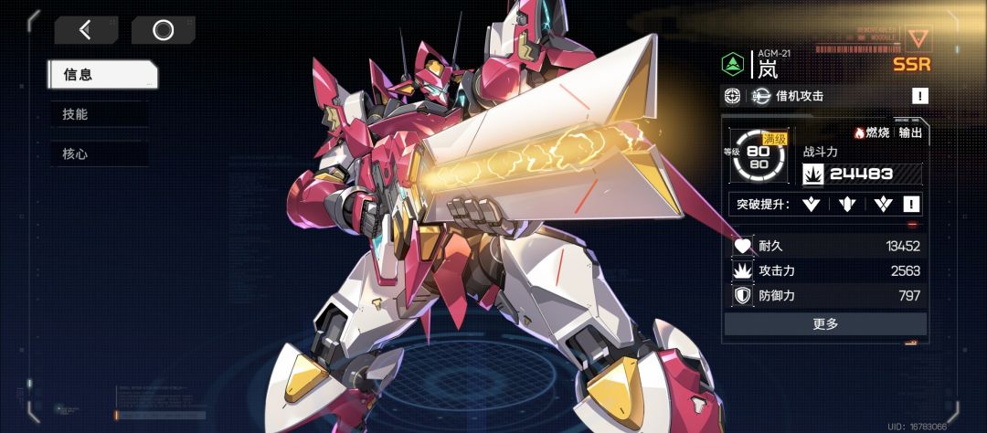 ssr输出之一,普攻蓄力激光作为主要输出手段,自身能挂灼烧,激光能消除弹幕,不依赖命座(策划要不把圆锤命座删了吧?),精神技期间激光1000%每秒伤害很高,但需要蓄力,且自身伤害加成极低,实际伤害不尽人意(也可能是优点,吃拐收益比岚大很多),但其支援技倍率优秀还能消除弹幕