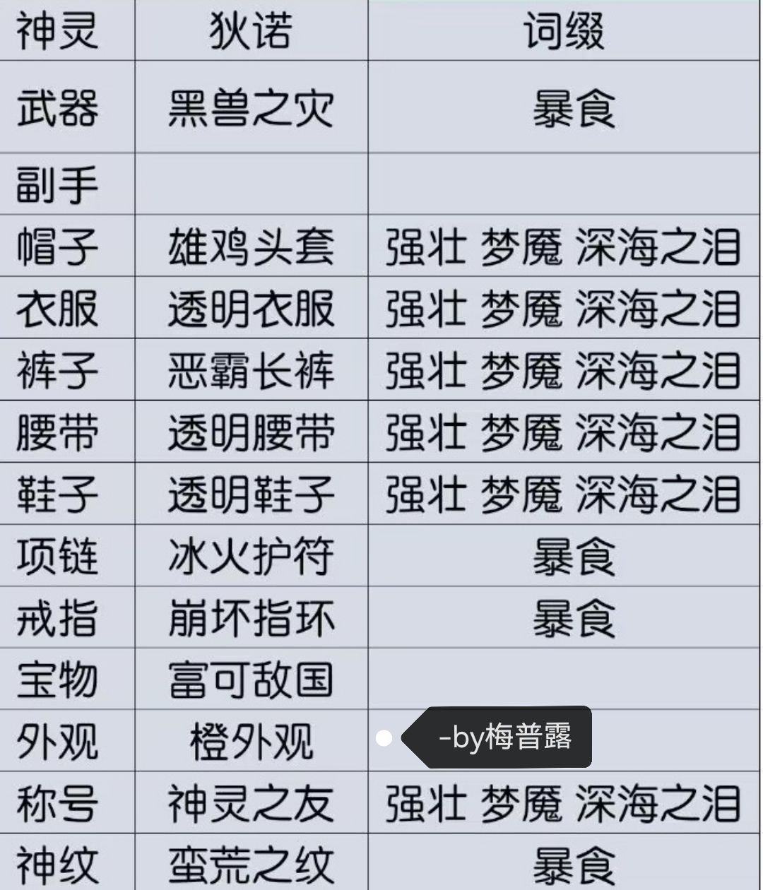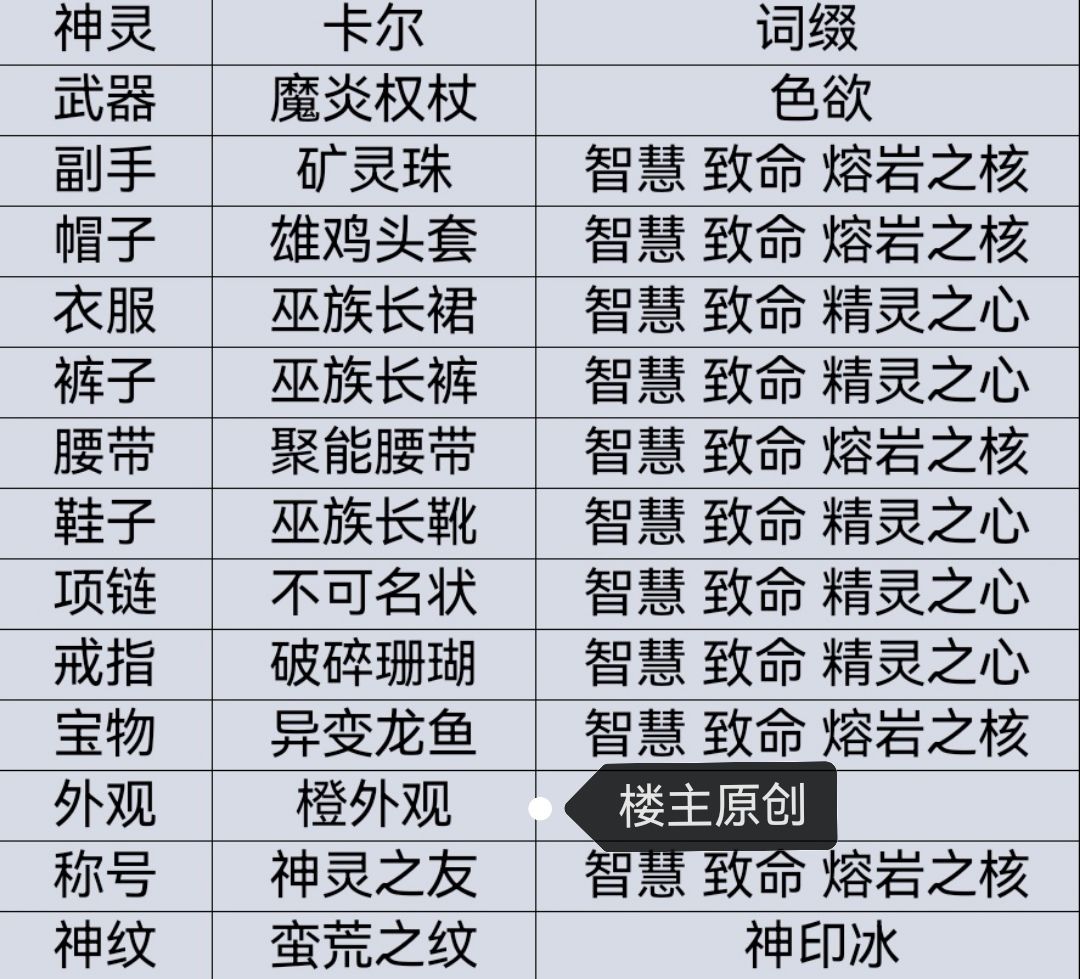 以职业维度来写,职业+装备名+掉落位置