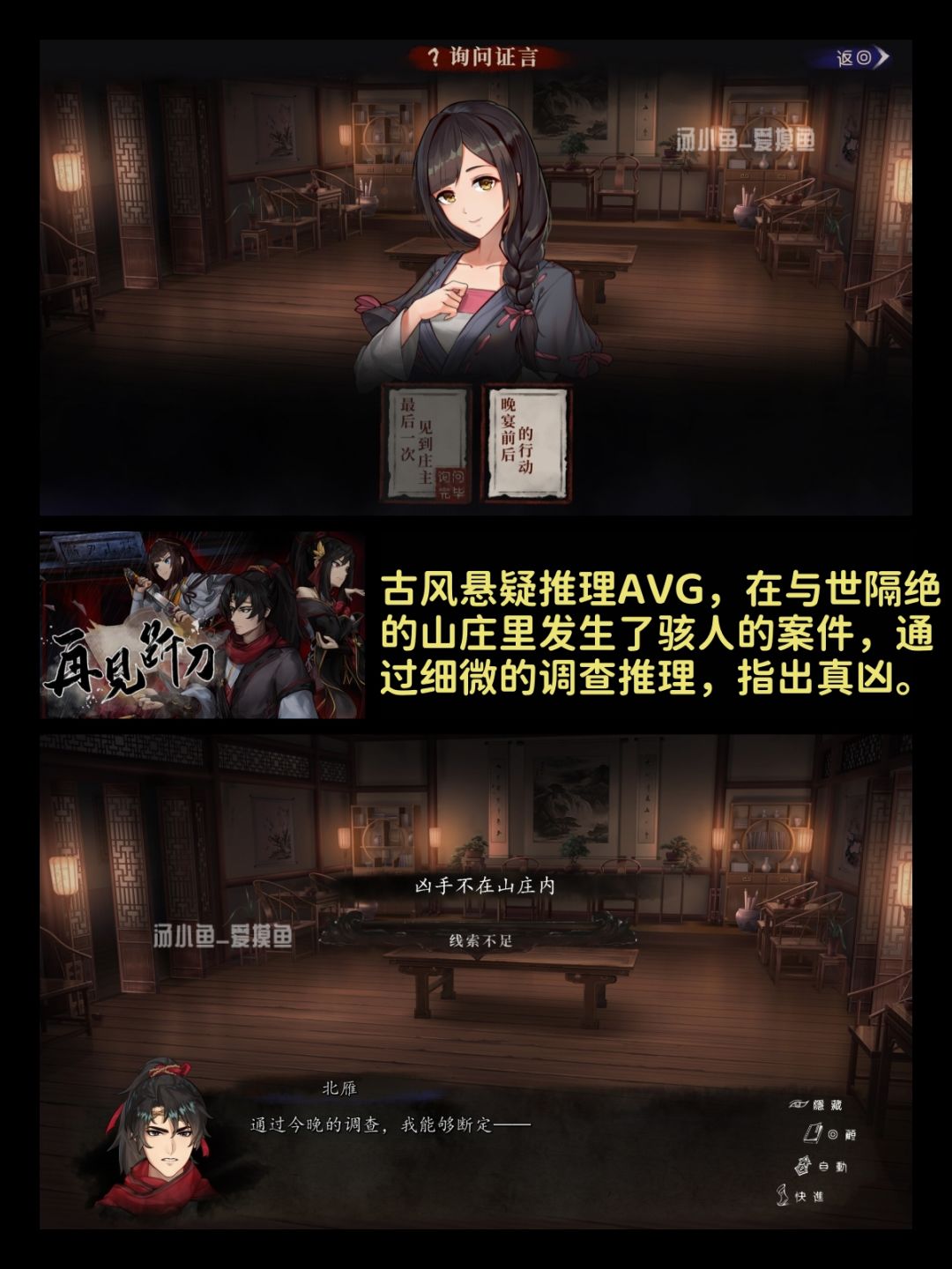 一款古风悬疑推理AVG,在与世隔绝的山庄里发生了骇人的案件,通过细微的调查推理,探明真相,指出真凶。