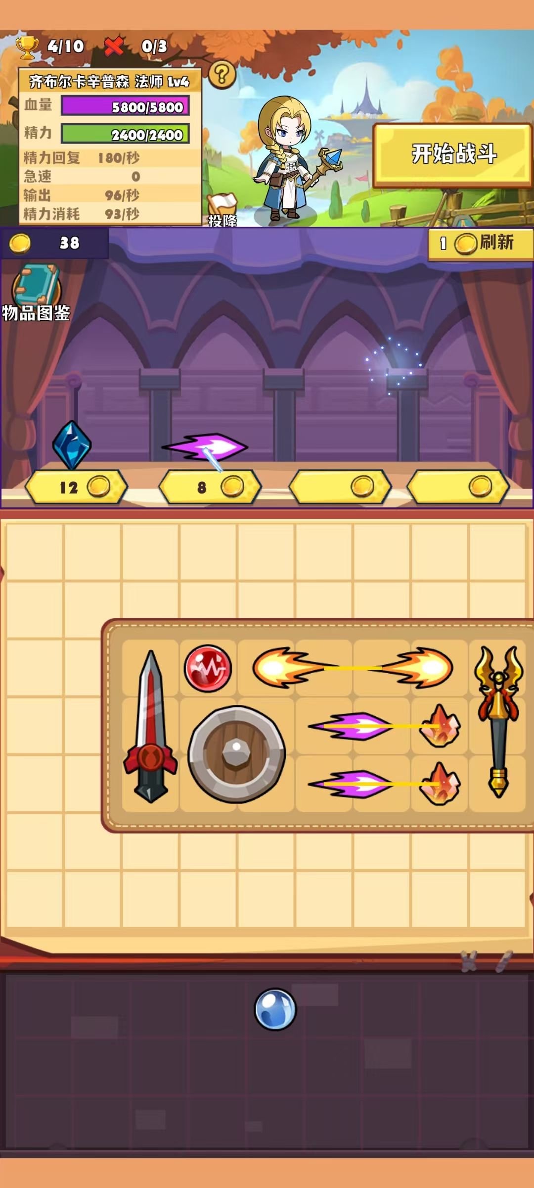 火法前期容易暴毙,前期使用剑和盾牌,舍弃法杖使用商店直接购买火焰石和法术,快速合成法术反而容易挺进后面几回合,但是发育容易断档