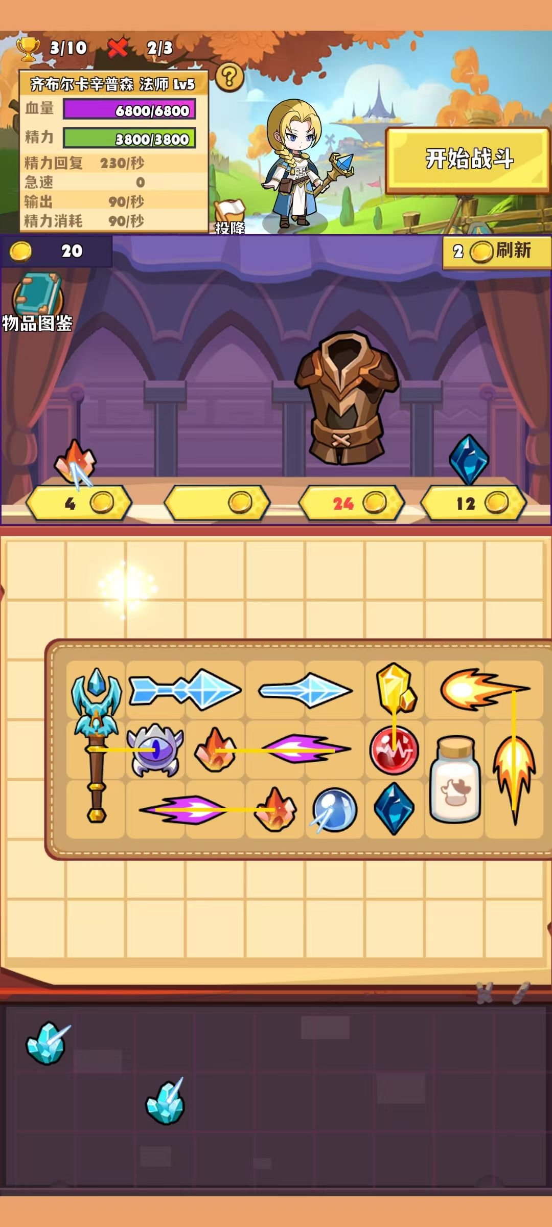 例如火法:优先合成火焰法杖,可以每回合固定获得火焰石,方便合成火焰法术