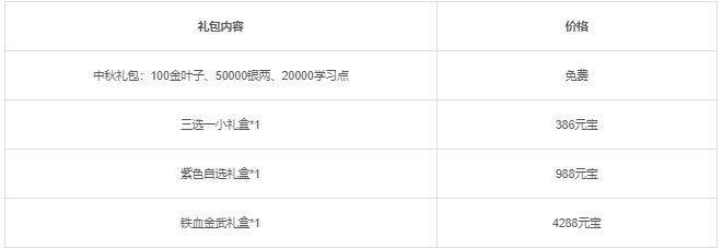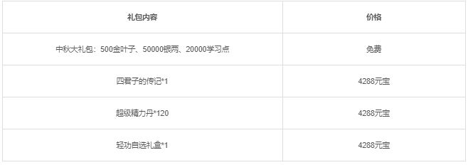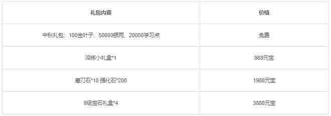 活动三:活动期间将限时上架中秋节礼包,礼包内容如下: