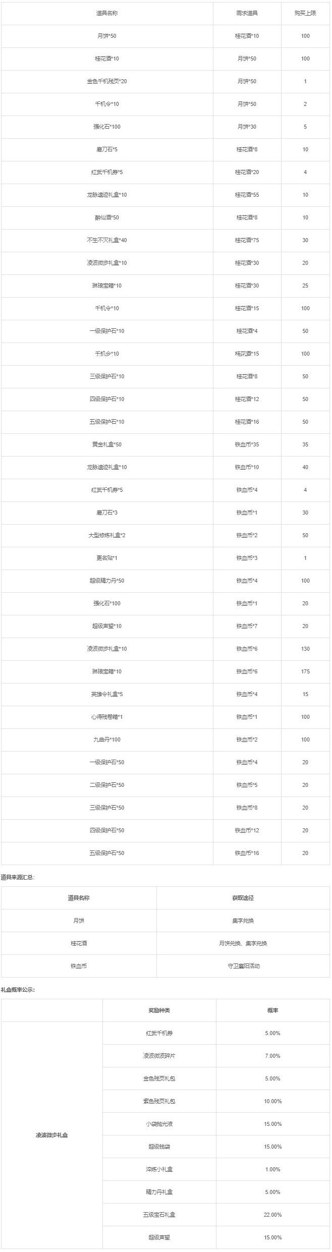 活动期间,通过“江湖磨砺”挂机,在挂机次数内必定掉落“花”、“好”、“月”、“圆”集字道具中其中1个,集齐四个字可兑换道具“月饼”,收集“月饼”可以兑换各式好礼。