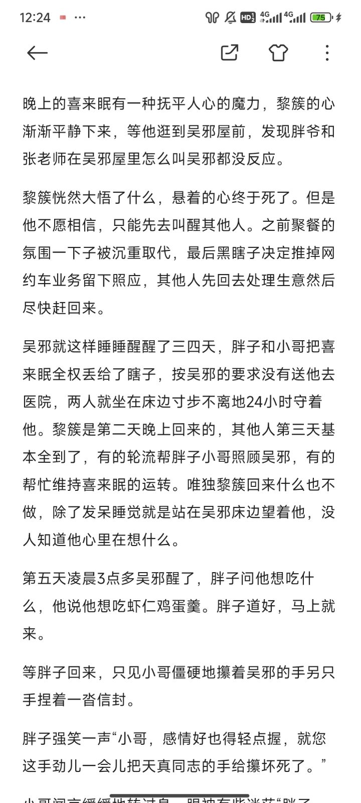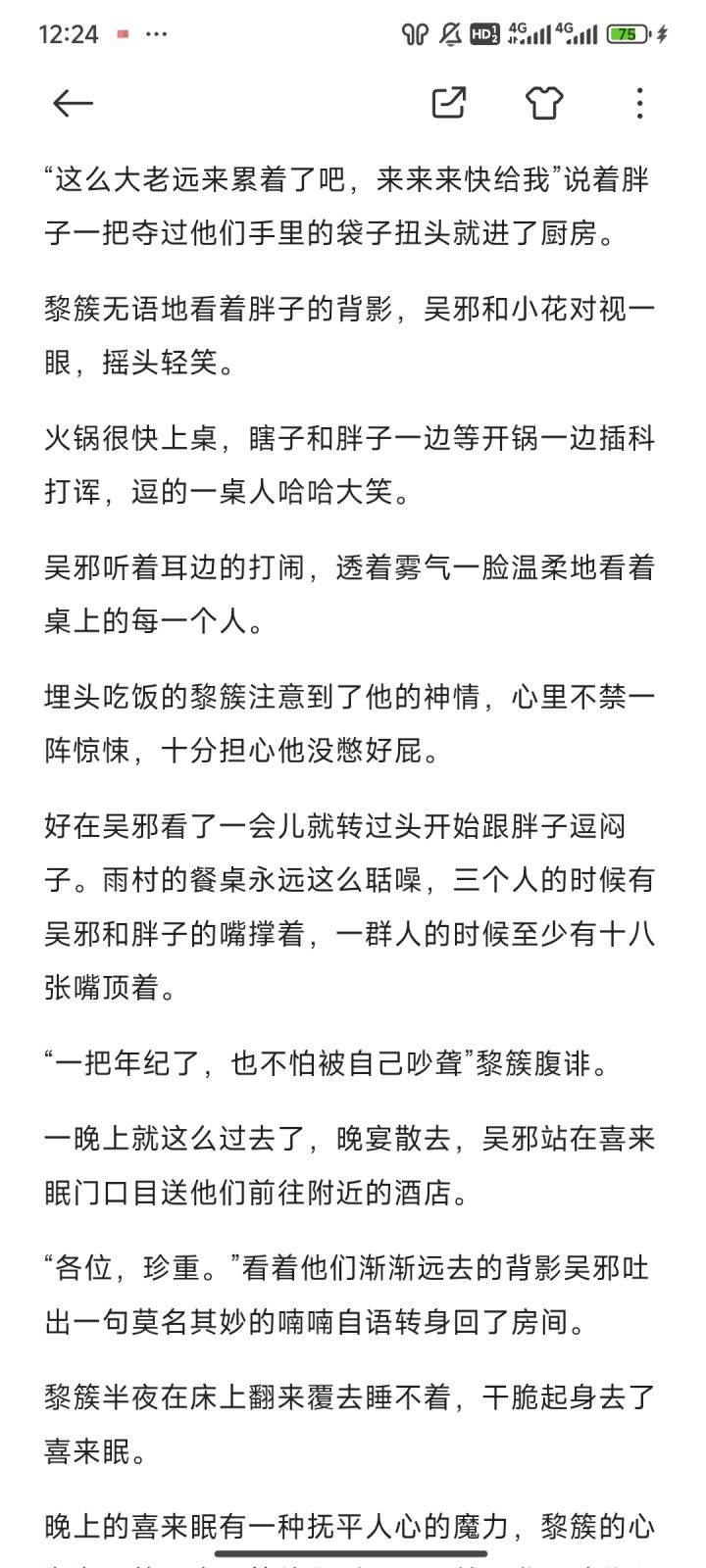 晚上的喜来眠有一种抚平人心的魔力,黎簇的心渐渐平静下来,等他逛到吴邪屋前,发现胖爷和张老师在吴邪屋里怎么叫吴邪都没反应。
