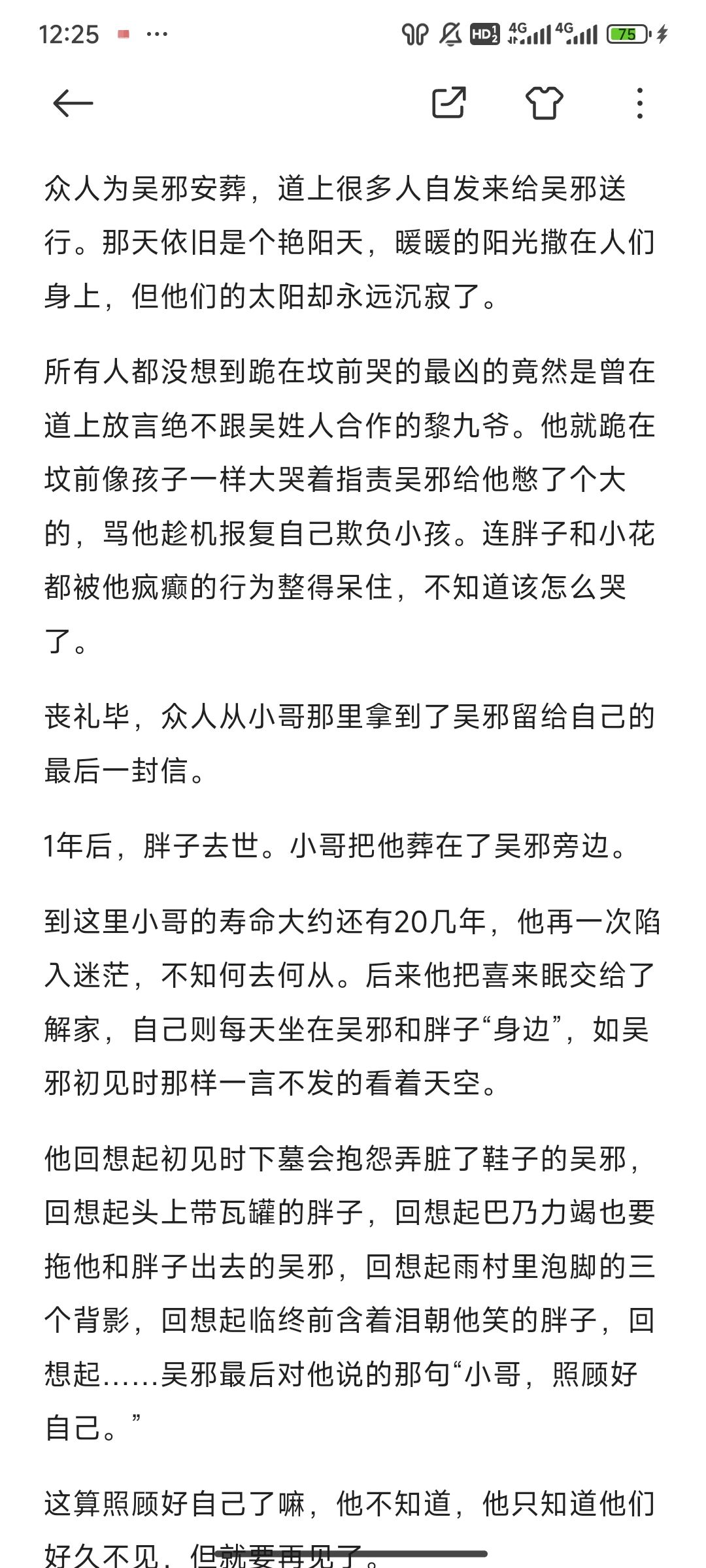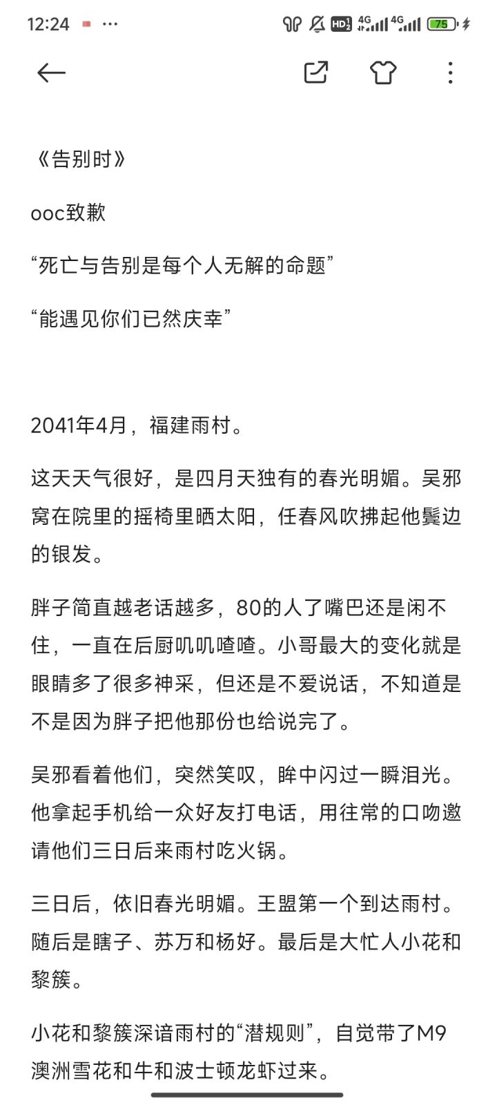 这天天气很好,是四月天独有的春光明媚。吴邪窝在院里的摇椅里晒太阳,任春风吹拂起他鬓边的银发。