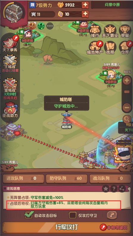 推荐把皇城周围的城防塔都占领,除了可以刷军功外,主要是拿占领特权,加强阵营守城伤害,额外强化自身防守能力,减轻敌阵主公对自身的消耗,防止自身兵力被清空,让兵力消耗细水长流。