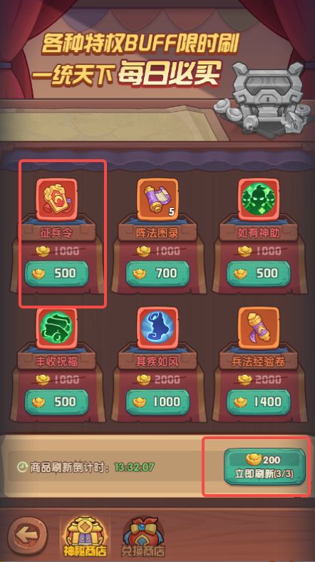 兵力有限,并且有兵力最低消耗限制,而兵力除了自然恢复外,就只有征兵令可以补充。因此想刷军功的主公,记得把商城每日3次刷新的征兵令都购买存起来,有能力的大佬也可购买征战主力礼包,等到皇城战开启后再使用。