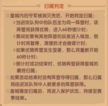 皇城战持续1小时,但如果皇城提前被其他阵营完全占领了,活动就会提前结束,非常不利于我方最后的刷军功抢排行,因此基于归属60秒的判断原则,我方可以一直在归属判定的60秒内保持派兵,不断拖延时间,直到活动时间耗尽,抢到充足时间给我方去刷军功。