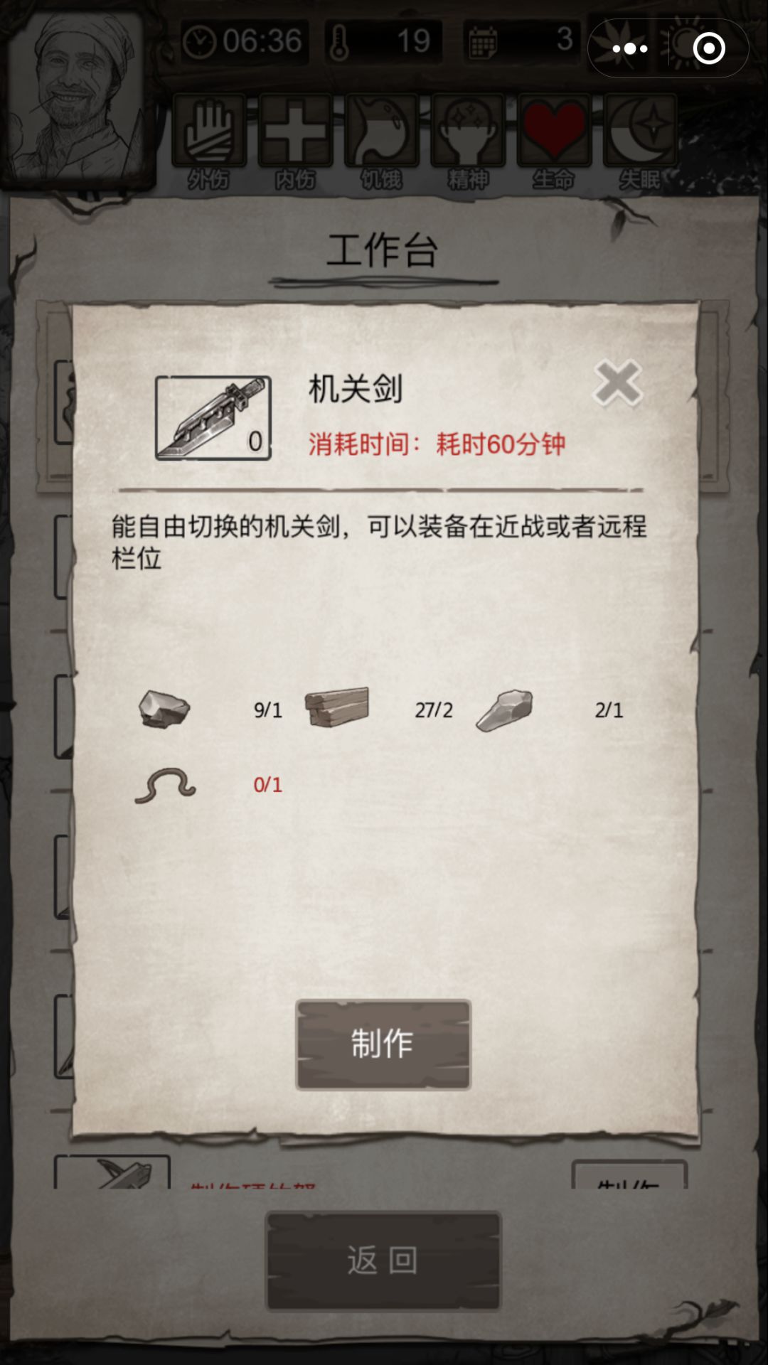我们可以看到,首先,机关剑的材料也不怎么复杂啊,除了需要一根兽筋以外其他材料都很好搞的,比硬竹弓、机关连弩之类的材料简单多了