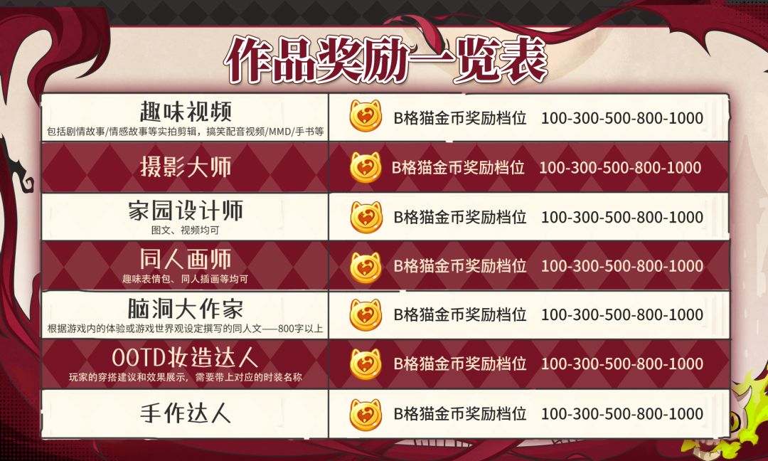 5、投稿内容包括但不限于:趣味视频、风景摄影、家园设计、同人画师、脑洞作家、OOTD、手作周边,不同类型作品将对应不同评选要求与奖励,具体请参见作品奖励一览表;