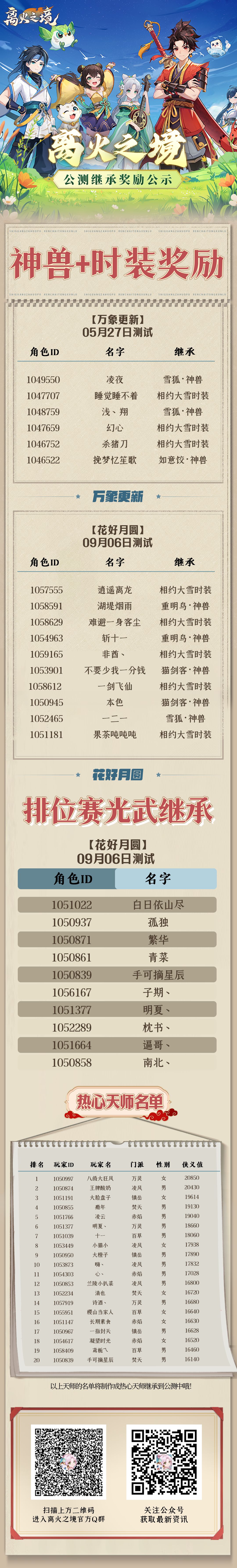 今天老白为大家带来的是离火之境“万象更新”和“花好月圆”测试中公测继承奖励名单,下面让我们一起来看看有那些寻火者获得了奖励吧!