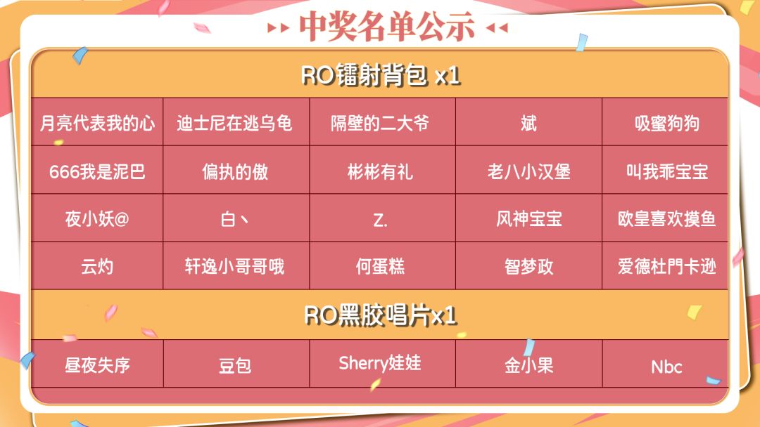 ✦恭喜以下20位冒险者获得【RO镭射背包 】一个,以及 5位【RO黑胶唱片】一个!