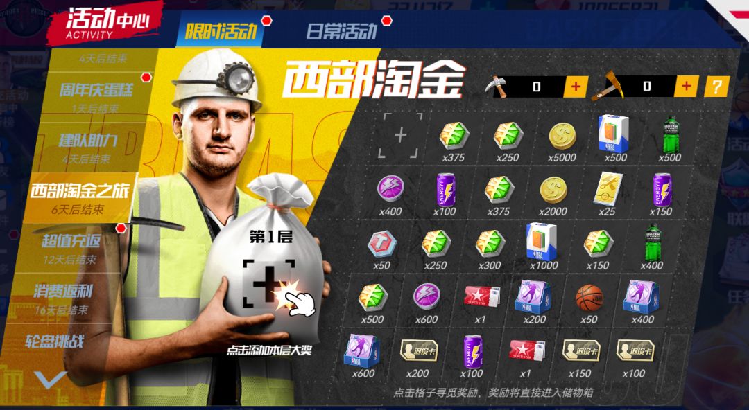 锁定需要的大奖,拿起铁锹开始淘金探险!每挖开一个区域,都可以获取到奖励,挖到锁定大奖,即可进入新一层的淘金探险。一起去西部淘金吧,[大师50选1]、[突破指导]、[顶级专精指导]、[球星招募函]、[体育馆升级材料]等珍稀“金矿”,在通往西部的路上等你发现!