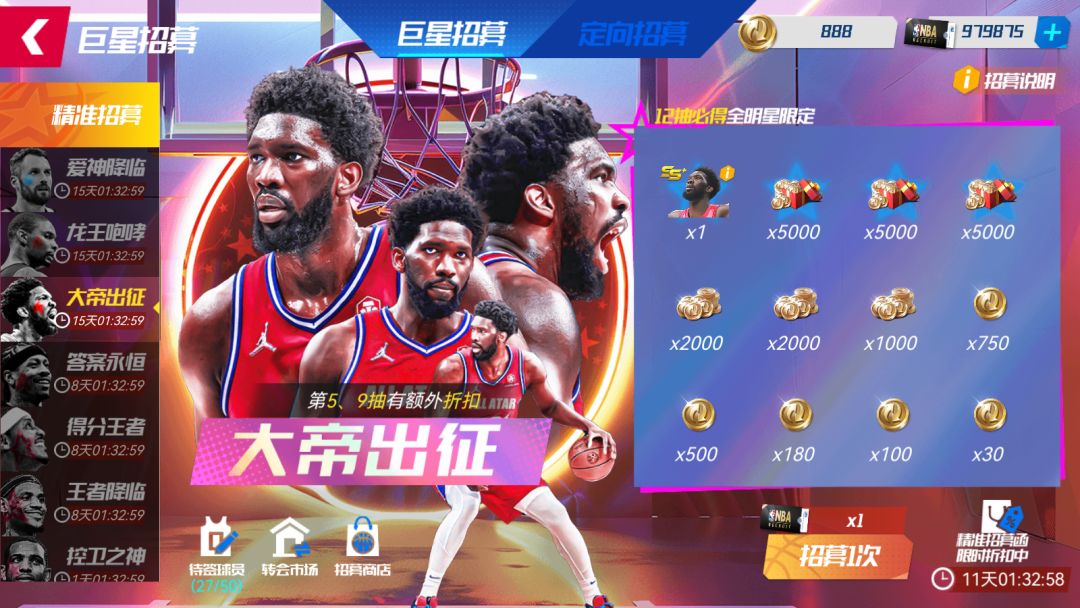 轮盘限时折扣中!活动期间,可使用【精准招募函】在【精准招募-大帝出征】池中,招募全明星队恩比德。