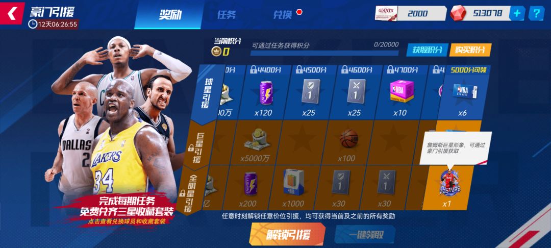 每次“抽一次”,则随机解锁一个奖励格,获取奖励格中的“全明星球员”或“转会费”。至多抽取12次,成功将全明星队恩比德签约入队!(卡池不包含球员套装)