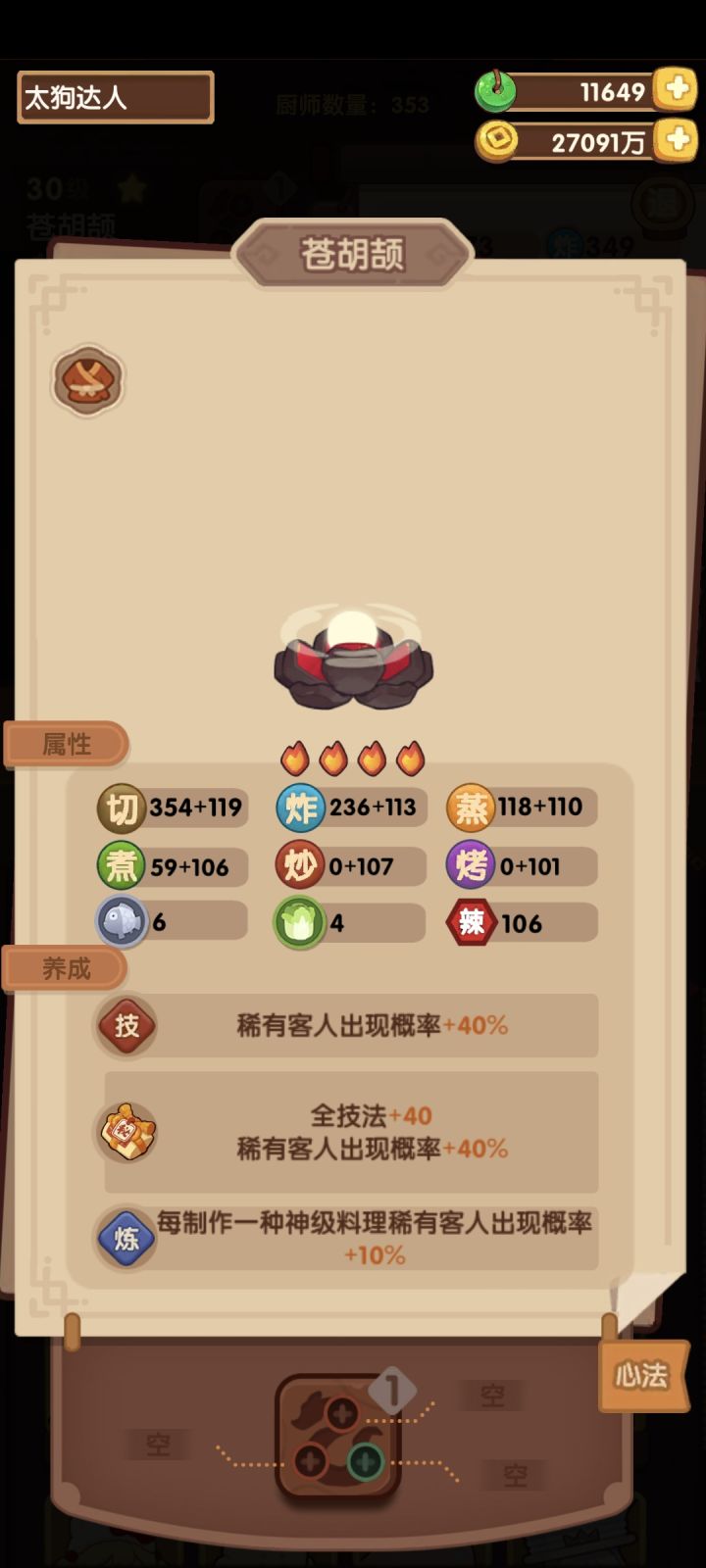 那么,莫扎特的修炼效果是什么呢?[・_・?]“场上厨师制作特级及以上的料理时,⚠️此料理⚠️贵客符文概率+10%”。那么问题来了,是加贵客率吗?还是说增加“贵客送符文”的概率呢?不管怎样,这些都无形中给日常刷符文增加了一个新的限制条件:菜谱品阶。ε=(´ο`*)))只有特以上的菜才能享受到10%的增幅,做不到特的菜还是老样子,还占了一个厨师位,没有初始贵客率,擅长技法为煮切,让我不禁思考这个厨师的性价比ヽ(゜Q。)ノ?