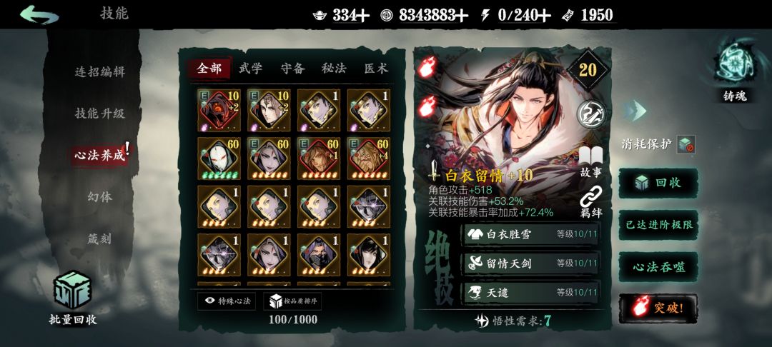 然后是提升心法,紫卡留“碧色双刃”“禁法魔僧”,“蛇眼”普通橙卡分解换白剑跟白奶,先做1/1的比例,之后更换为3/2的比例也就是白剑3张,白奶2张,然后是5/3,8/5等到后边有可以替换白剑或者白奶更好的卡再换下来去铭刻白剑跟白奶。心法慢慢提升就好,不需要着急。