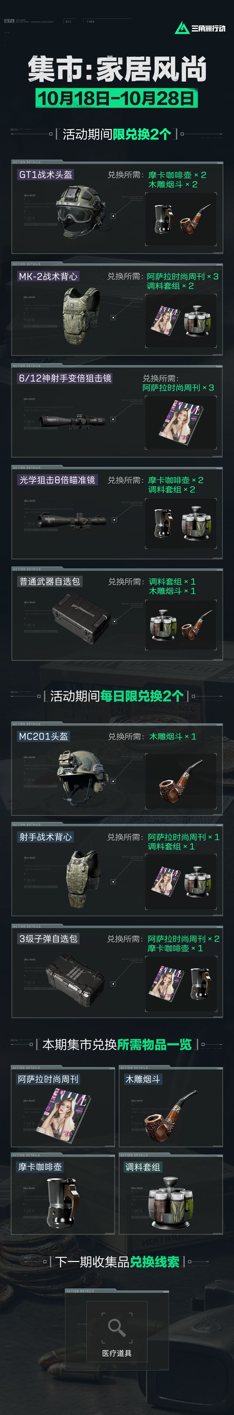 10月18日-10月28日,干员们可使用木雕烟斗、摩卡咖啡壶、阿萨拉时尚周刊、调料套组这4种收集品,限量兑换6/12神射手变倍狙击镜、光学狙击8倍瞄准镜、GT1战术头盔(全新)、MK-2战术背心(全新)等共计8种战备物资。