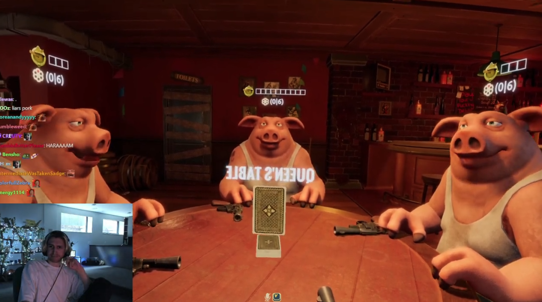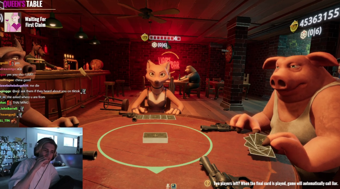 xQc前两天打开《骗子酒吧》的时候,被弹幕叫去国区玩,第一把就是四个猪头对弈。xQc兴奋得就像第一次见到外国人一样,在出牌、抿牌的同时不停地用谷歌翻译现场学中文、跟读中文。