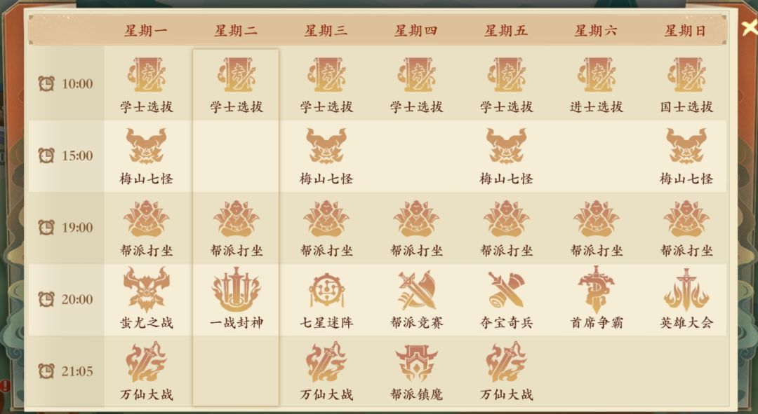 期间可以参加限时活动,10:00-21:00开始的科举乡试和15:00-22:00开始的梅山七怪,晚间活动19:30有帮派打坐、20:00有夺宝奇兵,夺宝奇兵给很多资源,一定来参加。