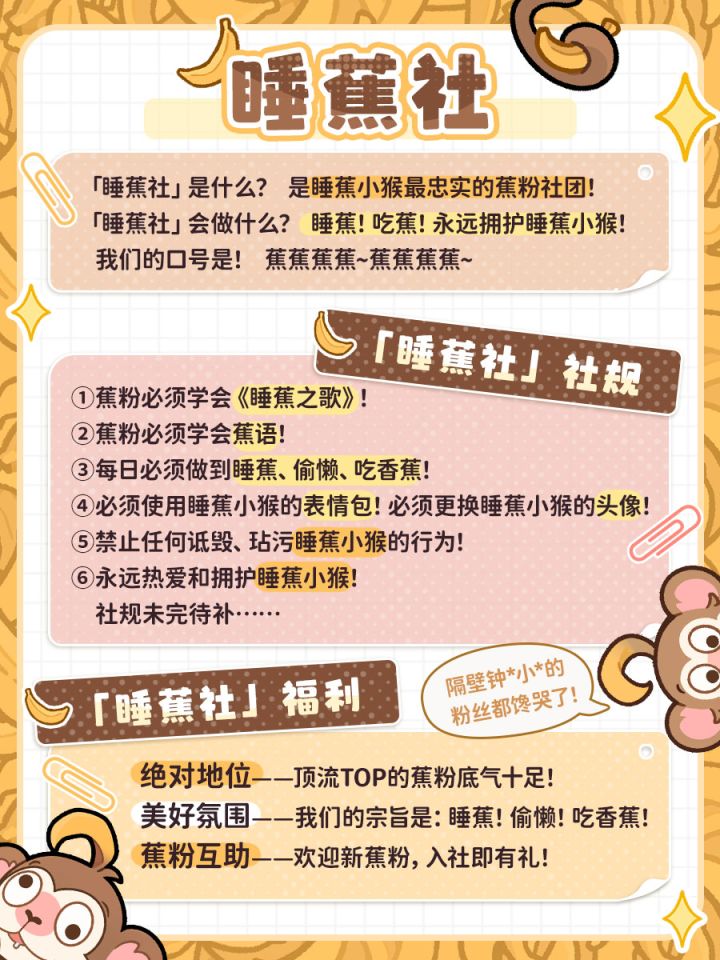 「睡蕉小猴」是当代最炙手可热的顶流,你入坑的不二之选! 我们「睡蕉社」打算把这个账号占领下来,改造成社团蕉号,就叫《小猴:星穹铁蕉》!