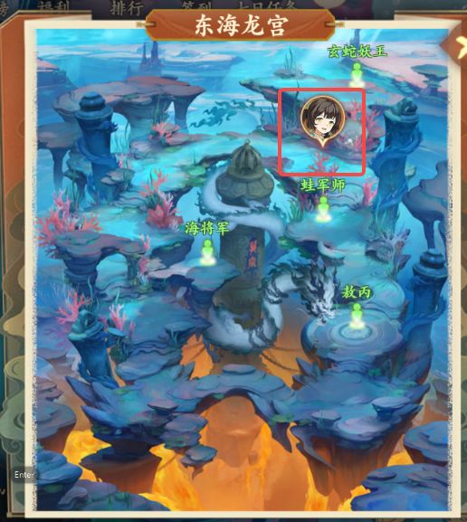 1、前往东海龙宫如图所示位置与龙宫侍女对话得知定海针下有奇怪声音,领取任务