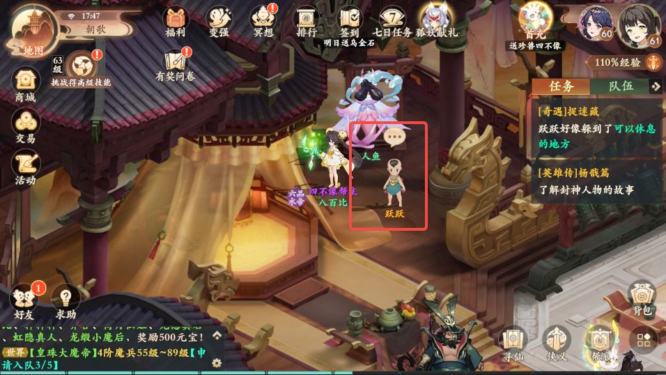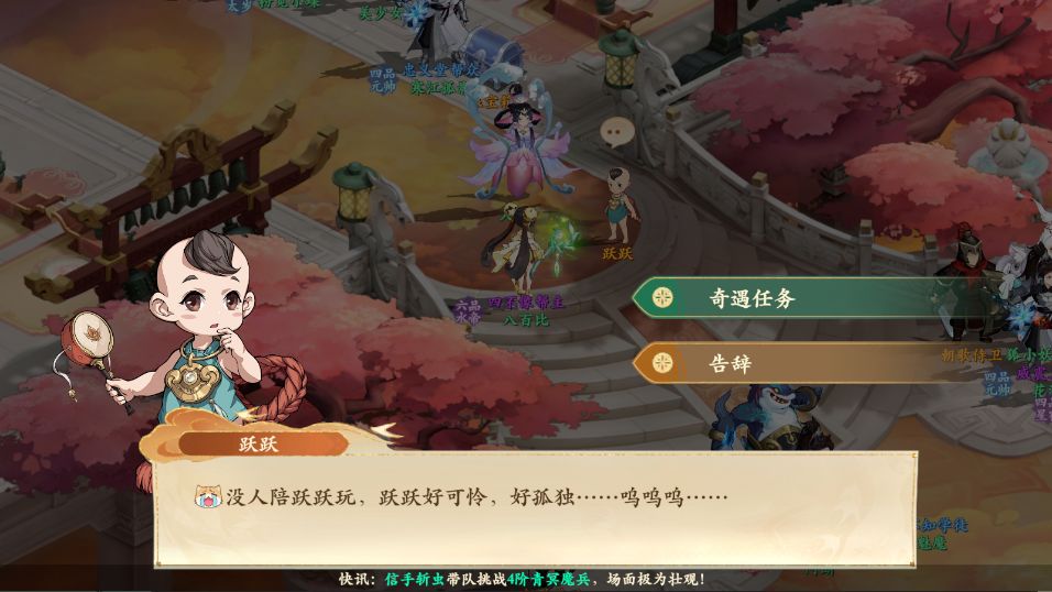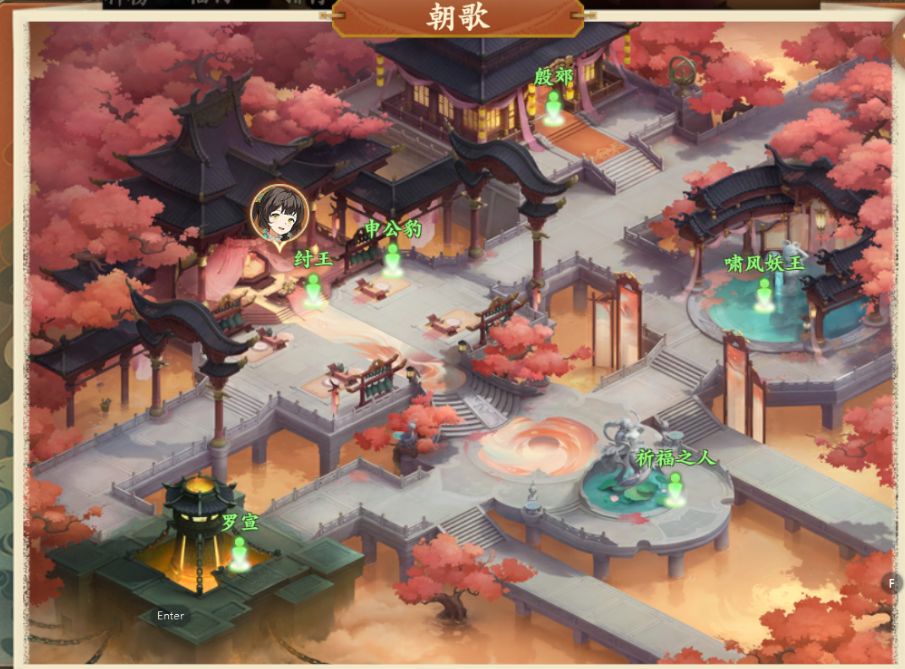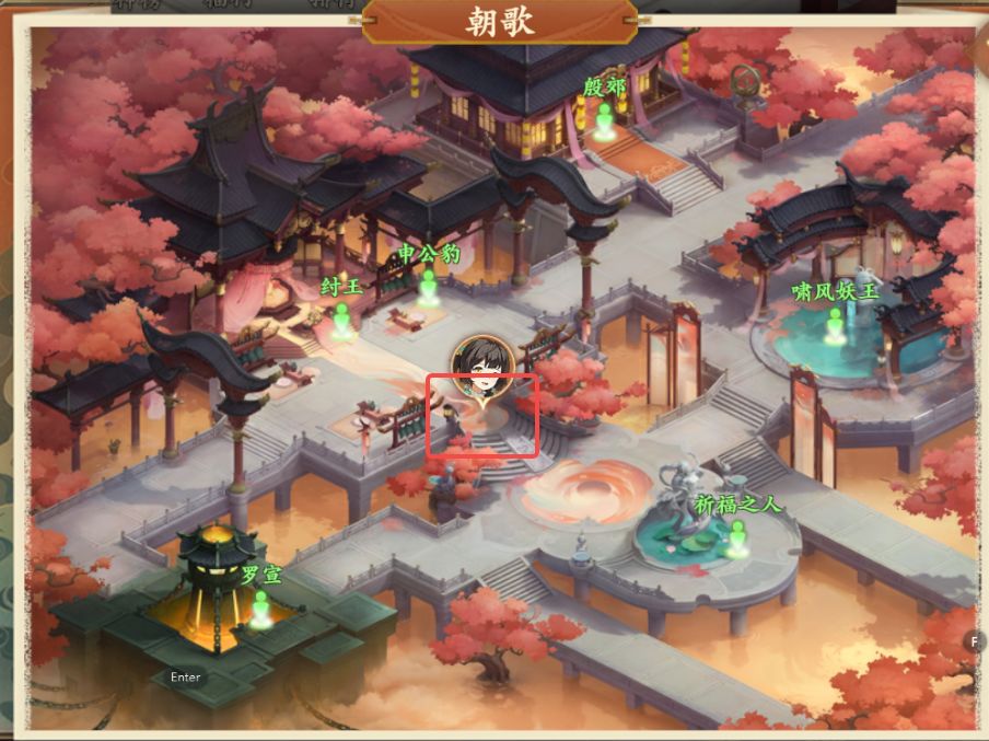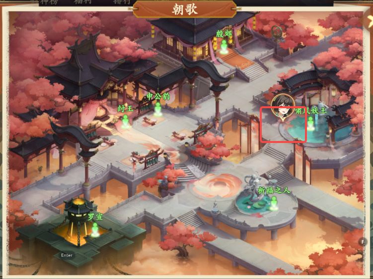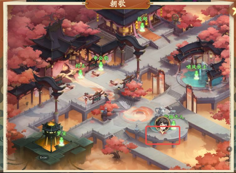 2、捉迷藏:朝歌中间台阶跃跃对话-纣王后方跃跃对话-右下祈福之人跃跃对话-左下罗宣左方跃跃对话-右上啸风妖王跃跃对话3、助人为乐:垂钓仙境中间桥上重病老人对话-西岐NPC药材商⼈,买药送回垂钓仙境桥上重病老人对话