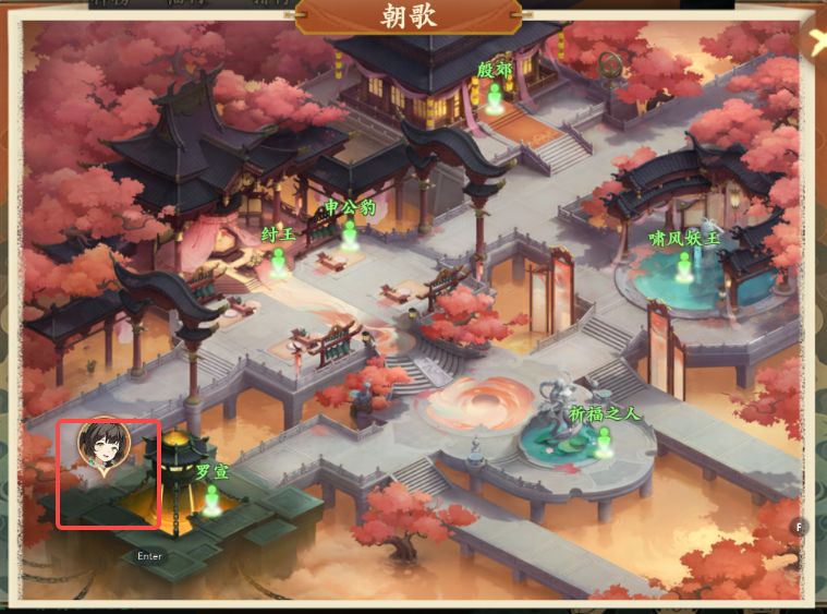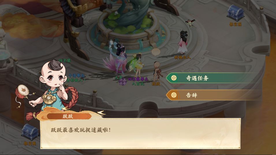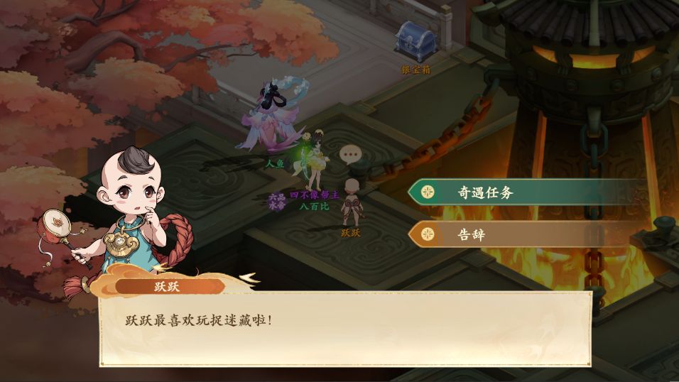 1、前往朝歌如图所示位置与跃跃对话,对话后得知想要有人陪他玩捉迷藏,在可以休息睡觉的地方藏着