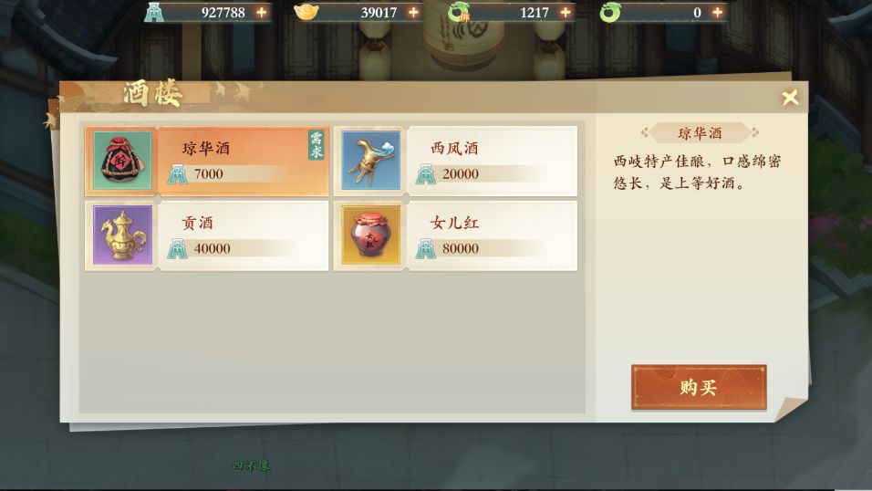 3、点击购买食物,购买一份琼华酒