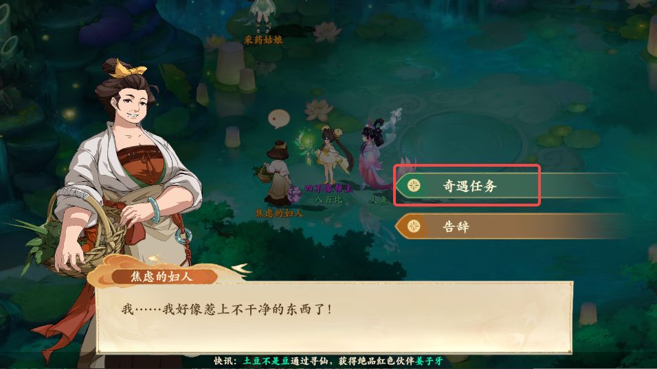 1、前往如图所示处与焦虑的妇人对话领取奇遇任务(建议点击采药姑娘可直接传送)