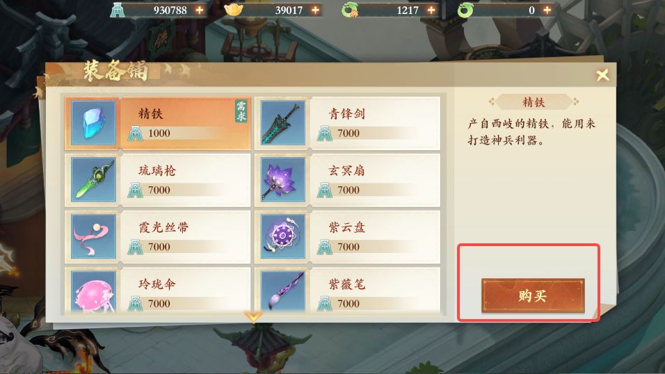 3、点击购买装备,默认第一个就是精铁,点击购买就好