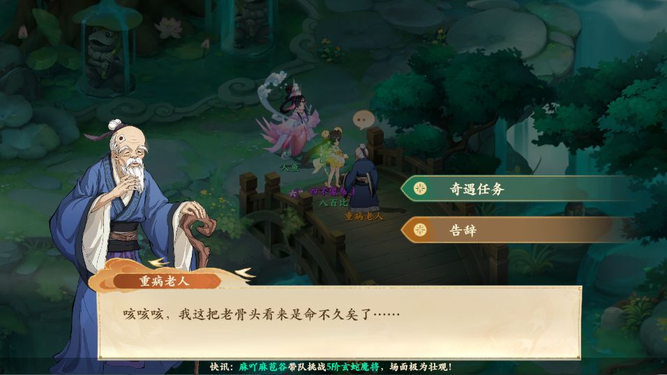 1、前往图示位置桥上与重病老人对话,老伯生病需要前往西岐打听一下能否帮助到老伯,接取奇遇任务