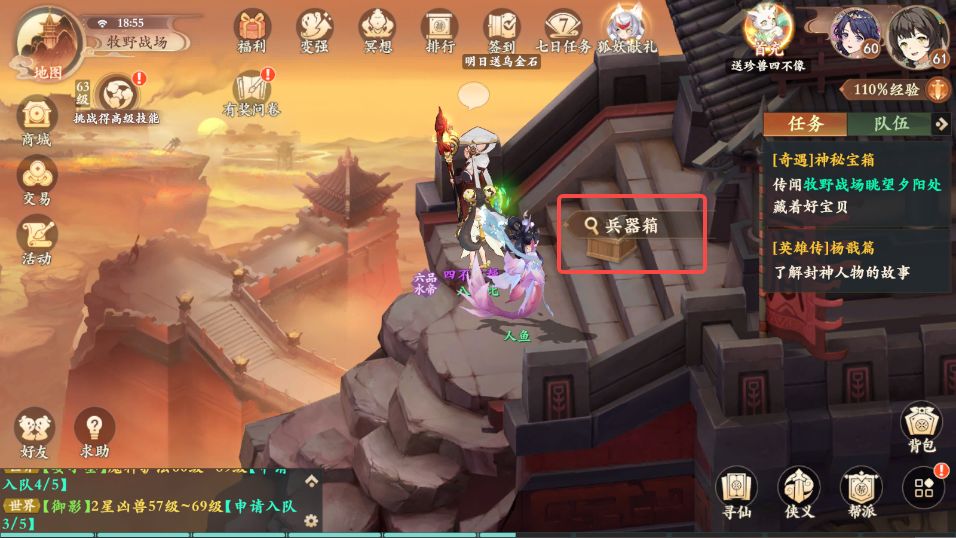 6、神秘宝箱:牧野战场地图中央下方附近村⺠-⻙护旁边的兵器箱-⻩⻜⻁对话