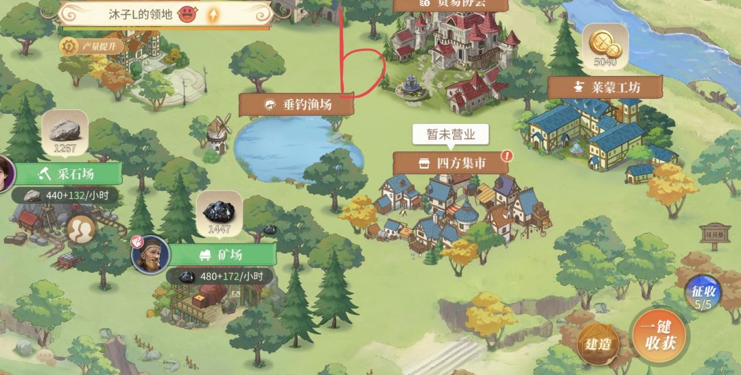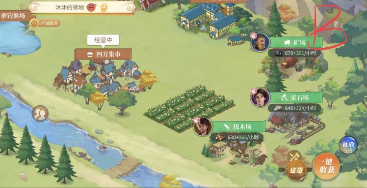 搭配一:只开垦河流上面的小块地方,如图AB,(有点不好的是,默认进入领地会在中间位置,需要往上划一下)