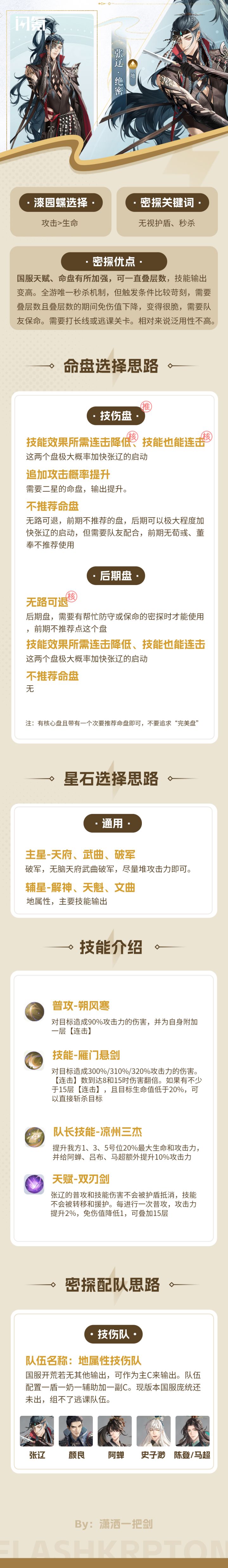 机制卡,无视护盾+斩杀机制,但因为张辽会给自己叠debuff,越打越脆,让本来就脆的破军更是雪上加霜,需要有很强的盾奶辅助保命,泛用性低,多用于作为对策卡逃课。