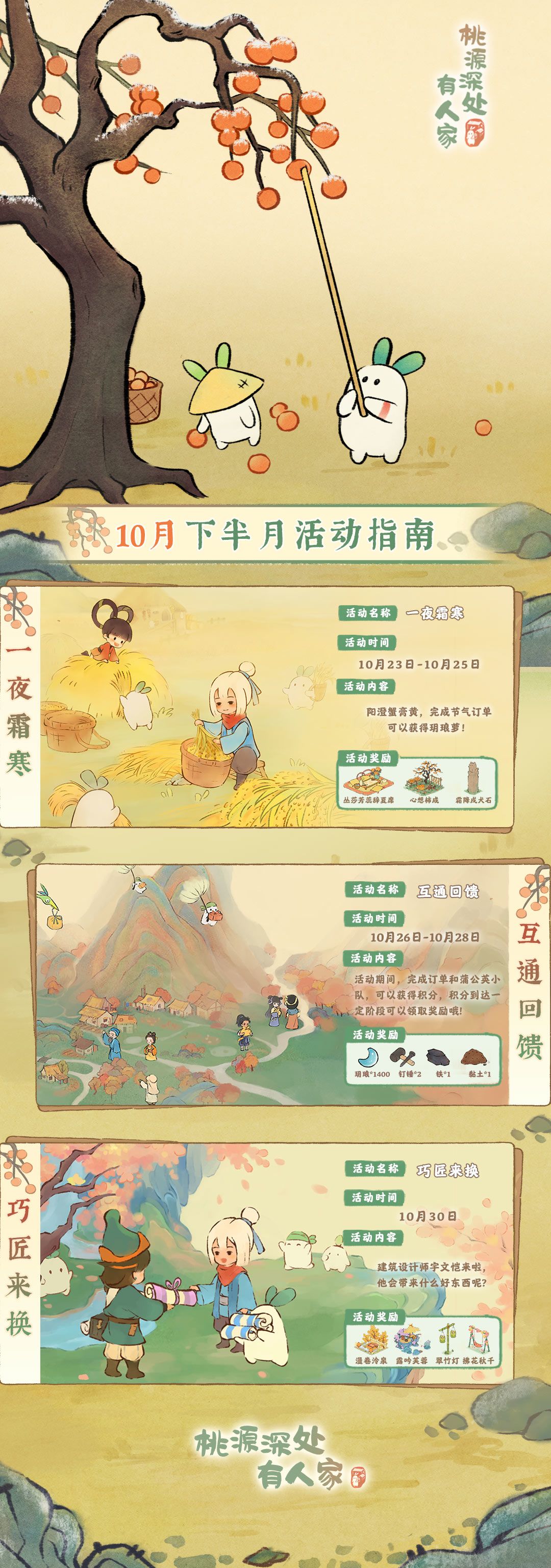各位萝萝山的山民好呀!桃源玉石主题新版本「玉成山河」已经开启啦,山民在游玩限时活动时也不要错过常驻活动哟!小花给大家整理好了十月下半月的活动日历,山民可以收藏日历按时参与活动萝~