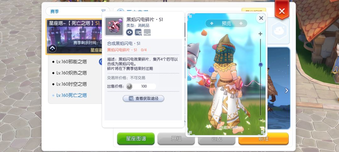 星座之塔总共四座各5层,1-3层难度尚可,4层开始难度上升。星座之塔每个自然月刷新,奖励每个月只有一份总计52个星座徽章,60wzeny,20个女武神的馈赠,4个黑焰闪电碎片(可合成一个幻化背饰)。