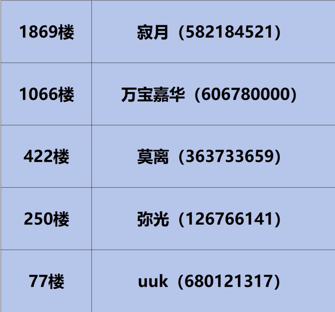 恭喜以下导演在本次活动中获得【归龙潮周边礼包(含流沙票根等)】*1,请在11月25日前扫描下图企微二维码,添加龙潮阁福利官-彪子,同时注明来意(备注TapTap平台中奖/领奖),填写准确详实的【个人收货信息】,如逾期则获奖资格作废。