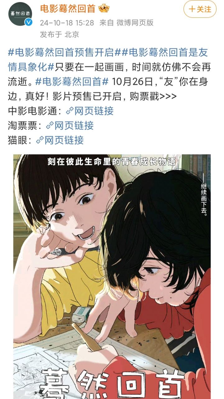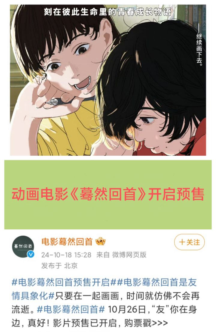 10/18号,《蓦然回首》电影官方微博发文,宣布这部由藤本树短篇漫画《蓦然回首》改编的剧场版电影已开启预售❗❗❗
