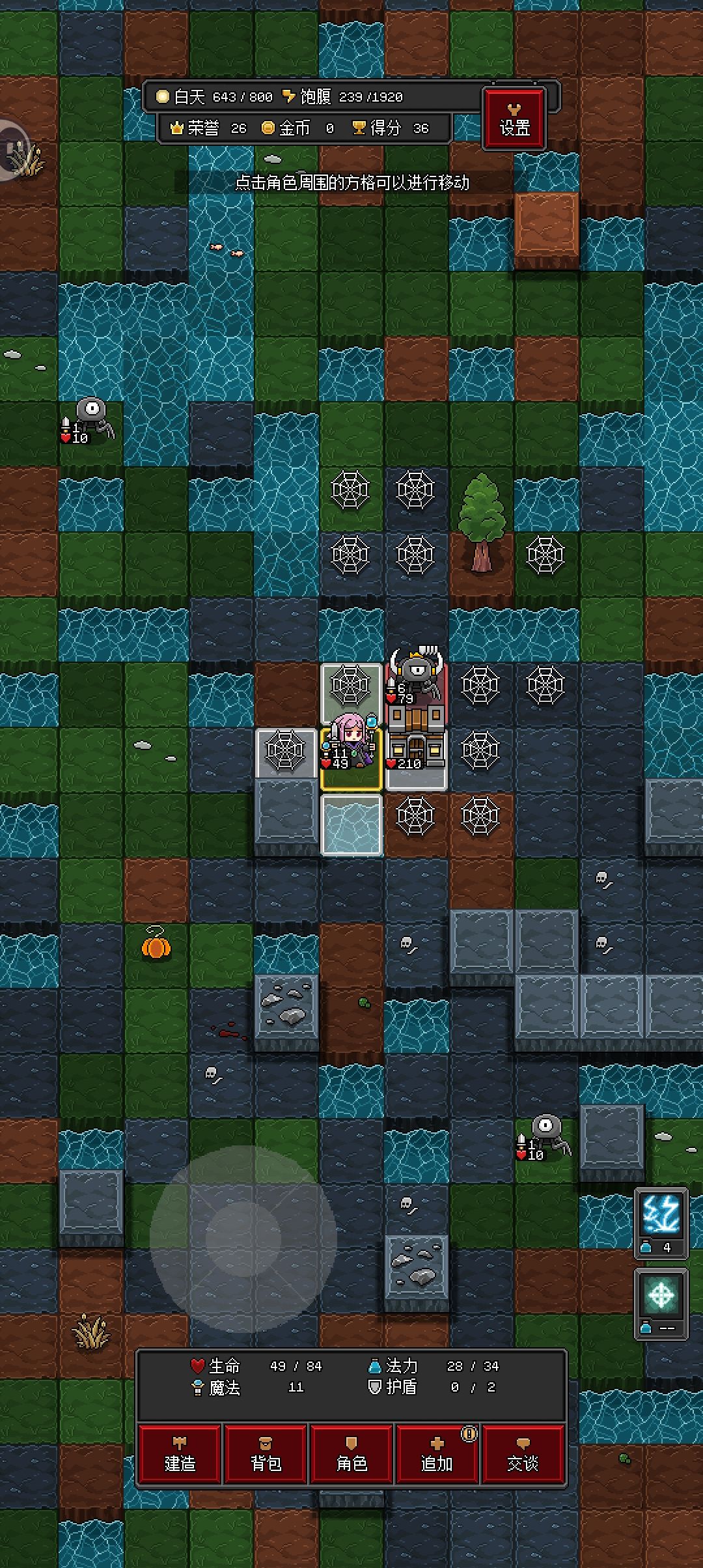 我们直接选择主手法杖副手小刀的高伤法爷开局,高达4点的高贵的魔法aoe伤害将对成群的敌人带来毁灭性的打击,(这也是晚上能活下去的原因之一)同时前期也可以做到尽量不加点升级,加点也只点攻击,尽量压低评分