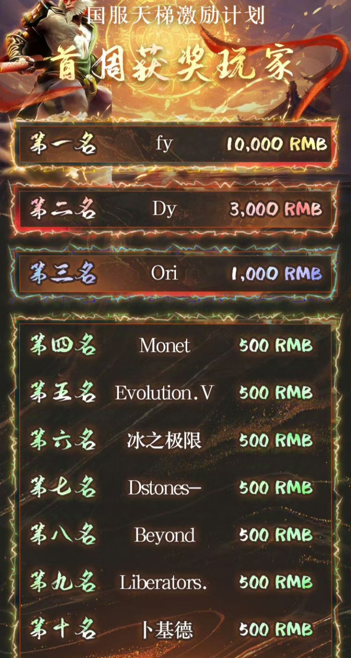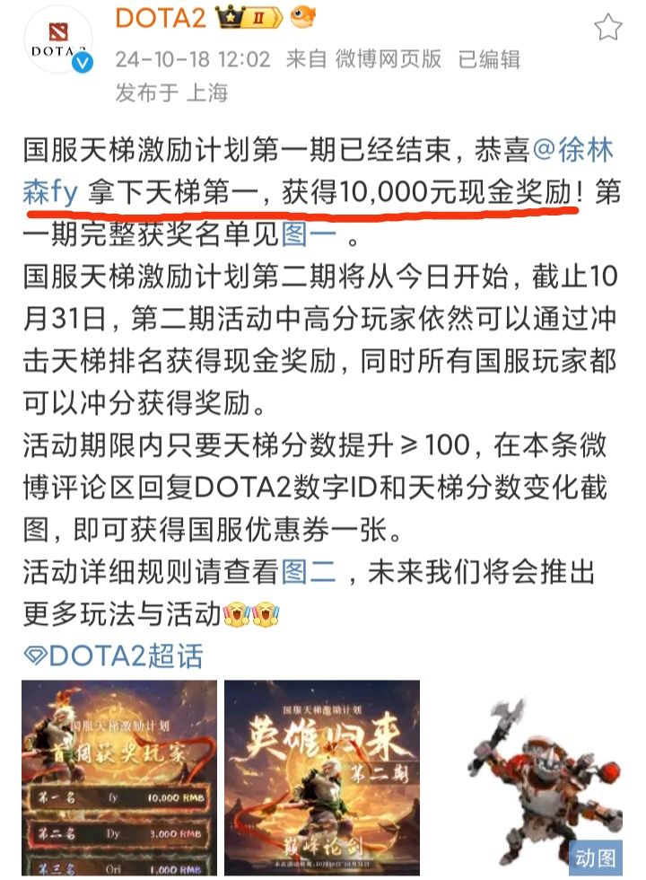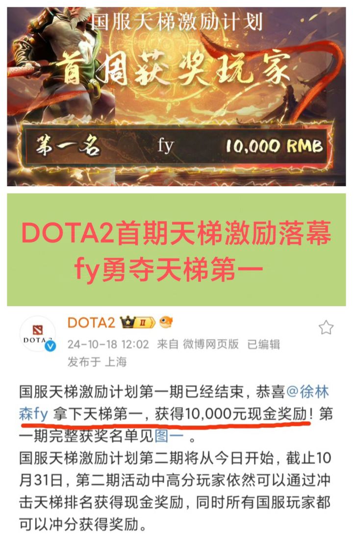10/18号,DOTA2官博发文,宣布首期国服天梯激励中fy夺得天梯第1,获得1万元奖励❗❗❗