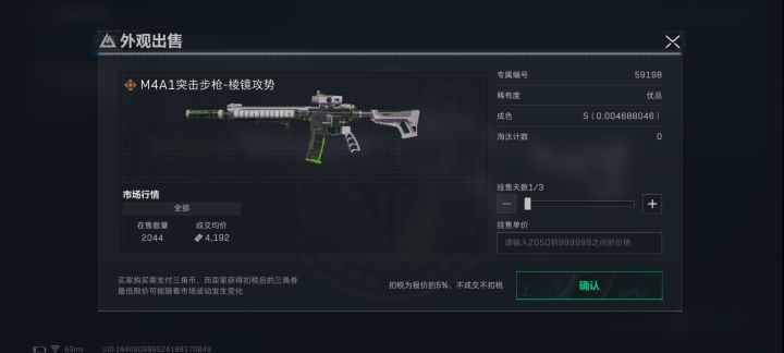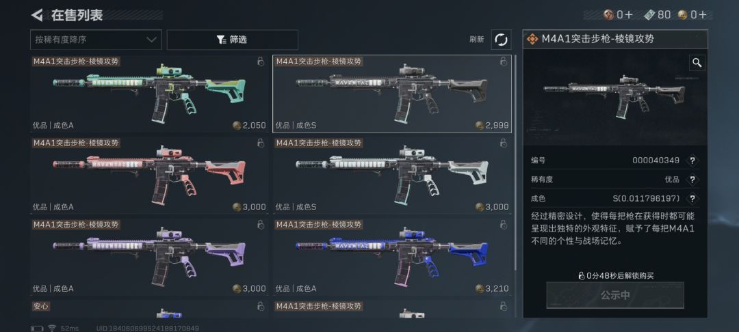 刚从akm转到m4a1,打了把一万七的占领心血来潮开了砖,结果居然真的开出金了,还是s成色😨。蓝色光效挺不错,但这枪的白加绿色太丑了,完全不如演示里的那种灰银带绯红或幽暗金绿色的半透明枪身😭。